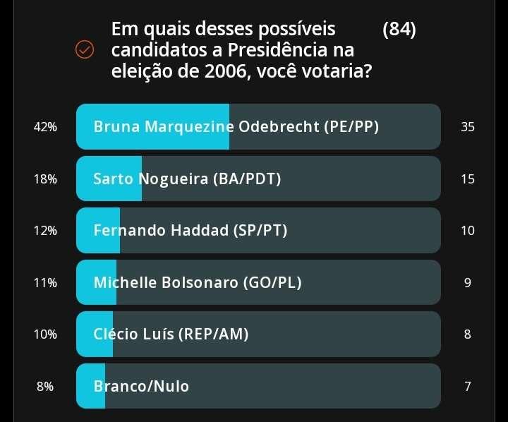 Os Resultados foram Divulgados Ontem, Sendo a Ganhadora, a Deputada Bruna Marquezine Odebrecht do PP com 42% dos votos.